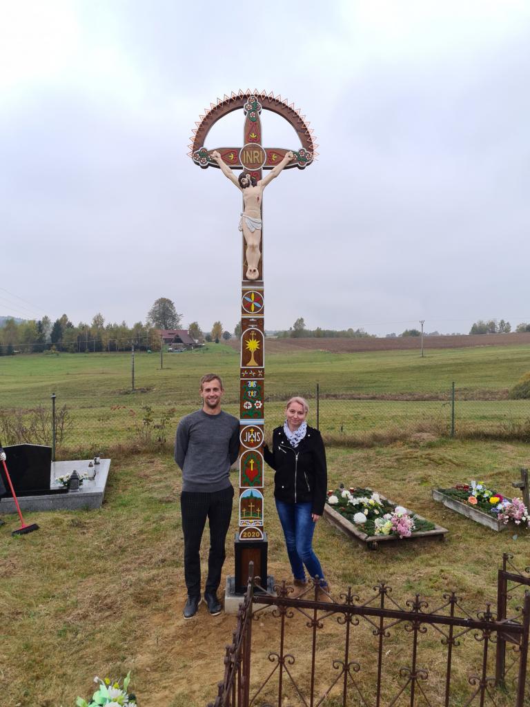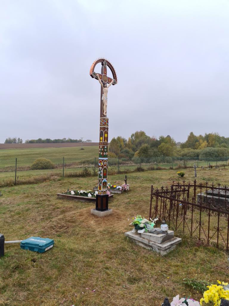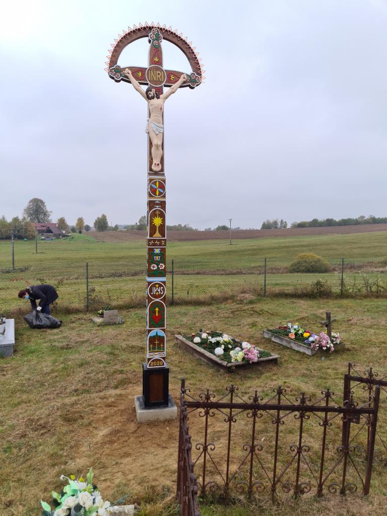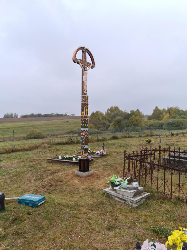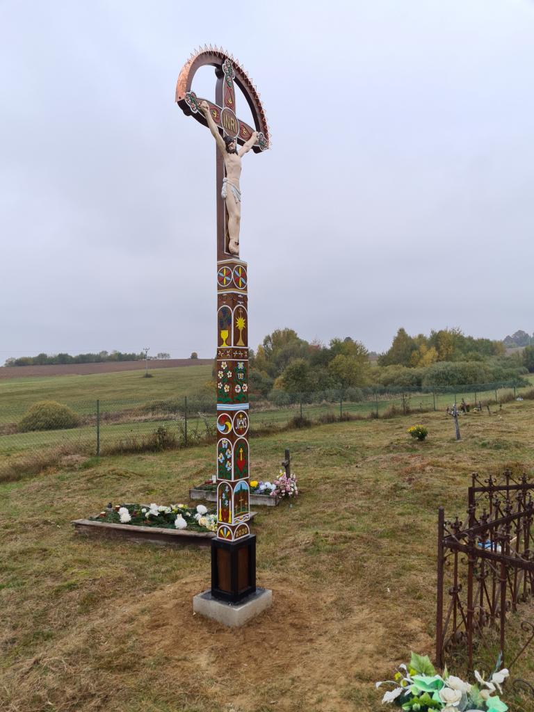 Vyrezávaný kríž je ručnou prácou Ing. Jozef Krnáč, PhD., ktorý je držiteľom značky "Regionálny produkt Podpoľania" od roku 2013. Požiadavku na jeho výrobu zrealizovala p. Lašáková. Samotnému osadeniu kríža dňa 23. 10. 2020 predchádzali práce zamestnancov obce spočívajúce v príprave betónového lôžka na jeho osadenie.
